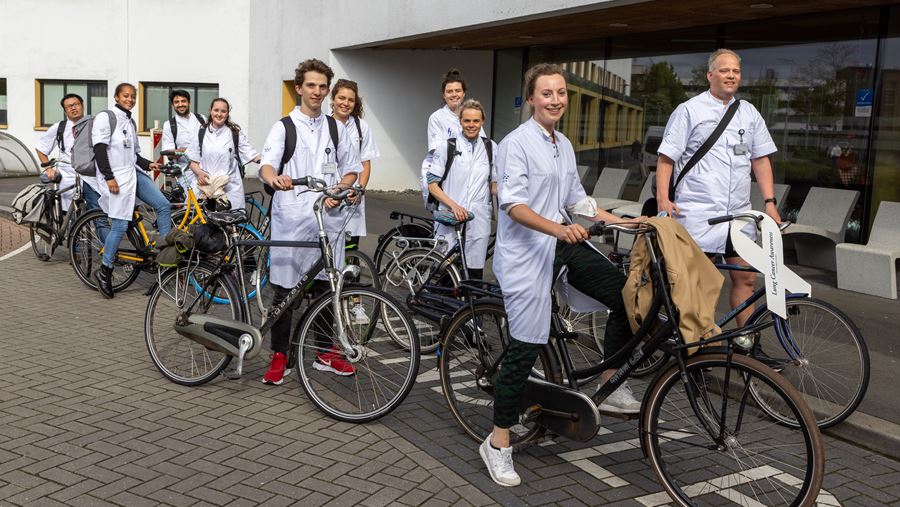Rond 18.00 uur kwamen de fietsers van het Wilhelmina Ziekenhuis uit Assen aan bij het Martini Ziekenhuis. Waar zij opgewacht worden door longarts Wouter Jacobs en Ton Tiebosch, lid raad van Bestuur. ‘Het Martini Ziekenhuis steunt van harte dit initiatief’ benadrukt Ton Tiebosch. ‘Als groot centrum waar veel patienten met longkanker multidisciplinair worden behandeld zetten we ons dagelijks in voor de beste zorg voor patienten met longkanker.’