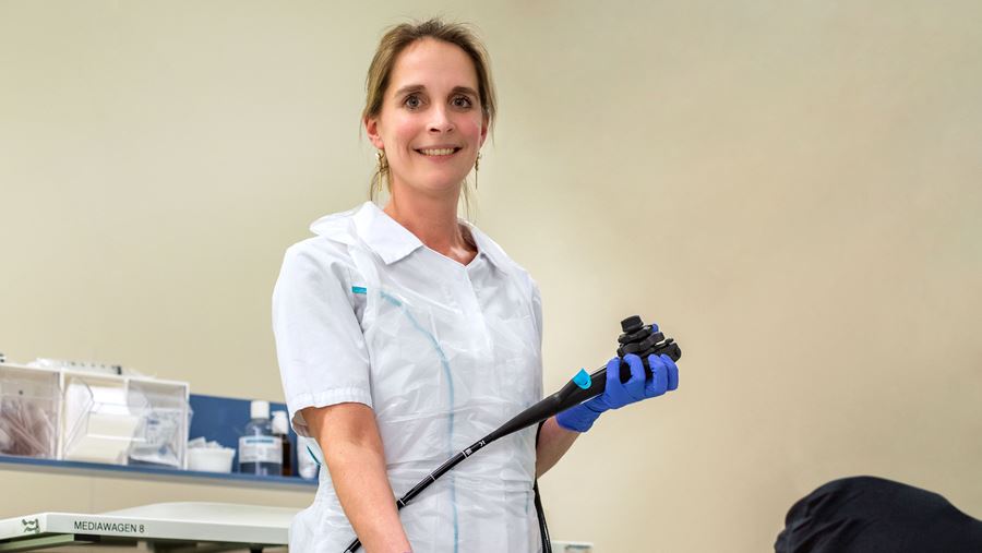 ‘Ten eerste maak ik deel uit van een leuke vakgroep. Het zijn allemaal verschillende persoonlijkheden die goed bij elkaar passen. Wat ik verder fijn vind, is de sfeer op de endoscopieafdeling. Dat team van verpleegkundigen werkt keihard, maar ondertussen wordt er ook veel gelachen. Die goede sfeer werkt ontspannend, niet alleen voor mij maar ook voor de patiënt. Een ander pluspunt van mijn werk is mijn brede werkterrein: ik verricht zelf zowel diagnostische als therapeutische endoscopieën voor allerlei verschillende aandoeningen. Tegelijkertijd zijn er ook patiënten die we niet kunnen genezen. Uiteraard proberen we hen ook goede zorg te bieden, door in de eerste plaats goed te luisteren. Vervolgens is het belangrijk om volledige uitleg te geven over wat ze kunnen verwachten.