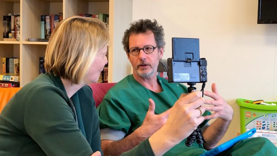 Na een paar eerste shots voor de vlog vuurt Marjorie de ene na de ander vraag af op Jan- Kees Zuiker. ‘Wat doe je eigenlijk als pedagoog?’, start ze haar vlog ‘Wij zijn speciaal aangesteld voor de kinderen die opgenomen zijn in het ziekenhuis. We doen twee dingen die belangrijk zijn: we zorgen dat kinderen kind kunnen blijven. Dus dat ze kunnen spelen, want juist in spelen daar ben je kind, legt Jan Kees uit. ‘En daarnaast begeleiden we de kinderen tijdens de verbandwissels.’