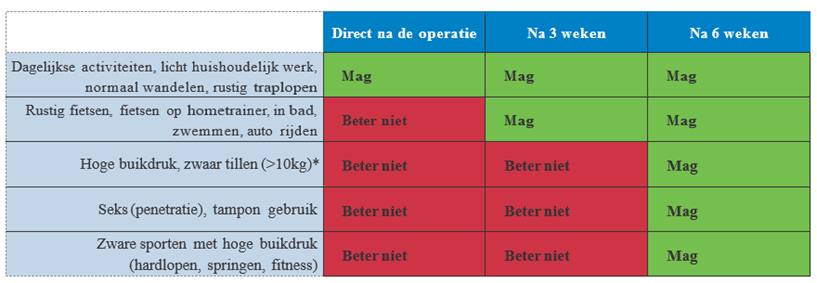 * Probeer de eerste zes weken activiteiten waarbij u voor de operatie de verzakking duidelijk voelde, zoveel mogelijk te vermijden. Probeer ook veel hoesten/niezen en persen op het toilet te beperken. Gebruik in overleg met uw huisarts bij bekende longproblemen hiervoor eventueel extra medicijnen om hoesten/niezen te voorkomen en eventueel Movicolon voor een betere ontlasting.