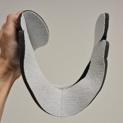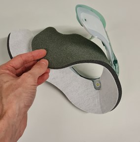 - Let op dat de binnenbekleding van de nekkraag zowel een witte als grijze zijde heeft die het foam bedekken. De witte zijde moet altijd contact maken met de huid. Wanneer u de bekleding correct plaatst, zonder plooien, ziet u de grijze zijde aan de buitenkant. Plaats hierna de binnenbekleding op de juiste plek op het plastic van de kraag. De bekleding steekt dan iets uit.