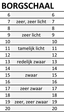 - 6 betekent geen enkele belasting en 20 betekent maximale inspanning.