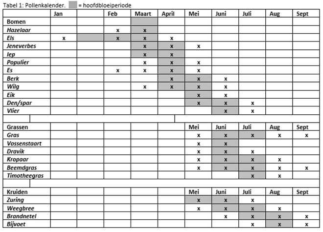In de tabel hieronder ziet u wanneer welke pollen in de bloei staan.