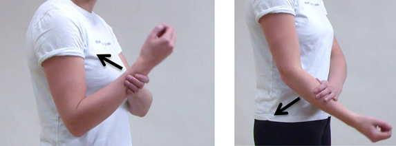 Voor het draaien van de elleboog houdt u de elleboog tegen de zij aan. Vervolgens draait u de elleboog, zodat u in de handpalm kijkt en vervolgens op de handrug kijkt. Zie onderstaande afbeeldingen.