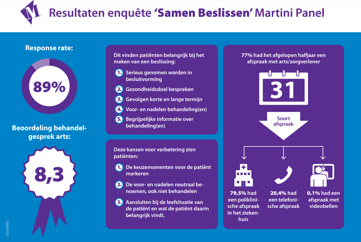 In juni 2021 hebben de leden van het Martini Panel de eerste enquête ontvangen. Met als doel ervaringen van patiënten en naasten met Samen Beslissen op te halen. De uitkomsten van de enquête vindt u hier.