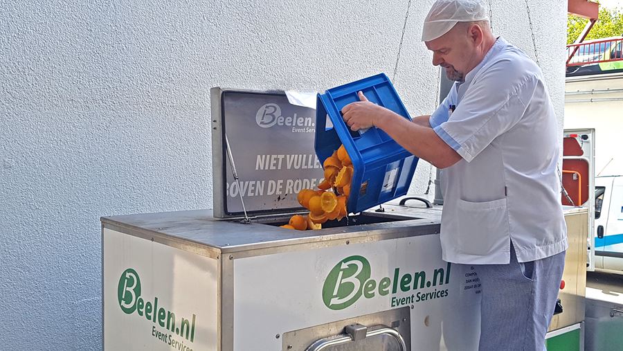 ‘De verspilling die er is en gedeeltelijk zal blijven wordt op circulaire wijze op ons terrein verwerkt. Daarvoor hebben we een composteermachine van een evenementenorganisatie in bruikleen (zie foto). Normaal composteert deze machine het groente en fruit afval van festivals, maar aangezien deze dit jaar niet doorgingen konden wij ermee experimenteren. Het is een pilot om te kijken of wij er als ziekenhuis ook structureel gebruik van willen maken.’