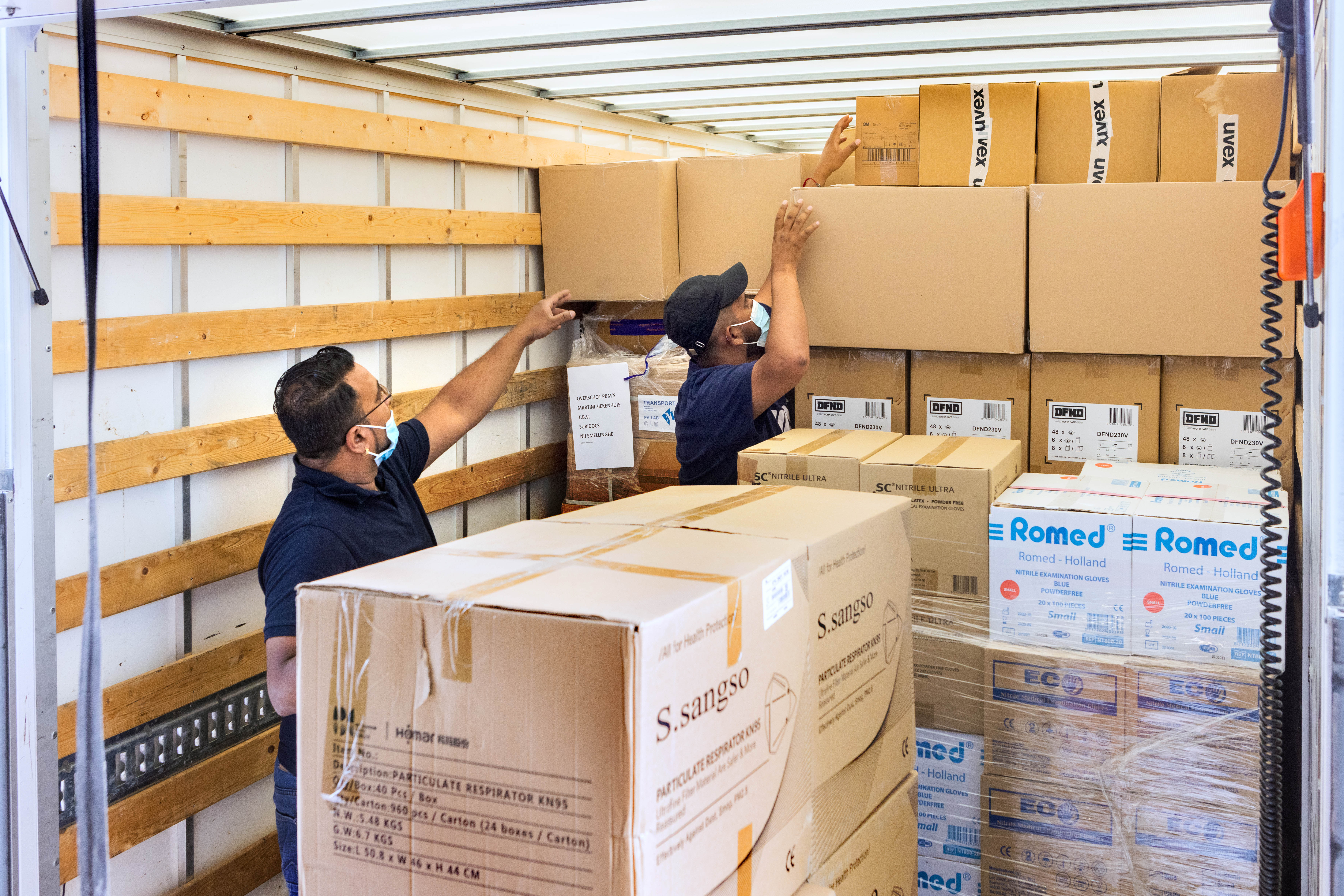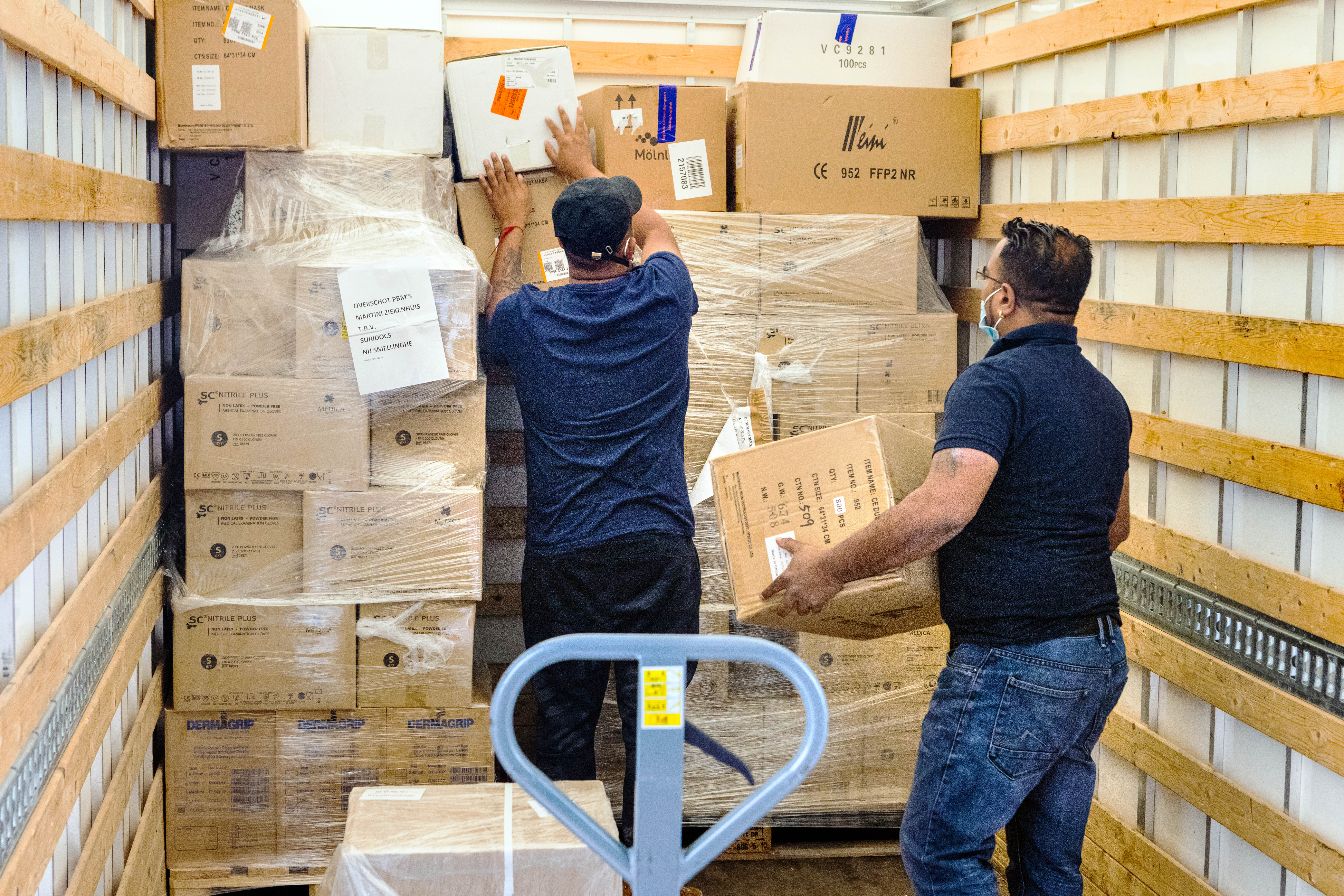 Nu onze voorraden van beschermingsmiddelen meer dan ruimschoots op orde zijn, besloten we om mondneusmaskers, isolatiejassen en beschermingsbrillen op te sturen naar onze collega’s in de zorg in Suriname. Uit eigen ervaring weten we hoe zwaar de zorg voor coronapatiënten is én hoe belangrijk het is om je veilig en beschermd te voelen tijdens het werk. Als we daar iets aan kunnen bijdragen, doen we dat heel graag! Vrijdagmorgen zijn zestien pallets vol met goederen opgehaald. De organisaties Su4Su en Suridocs organiseren het transport. Succes collega’s!