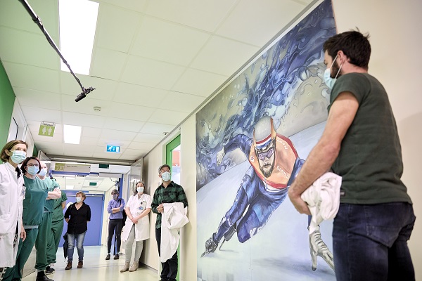 Met een levensgrote schildering bedankt Sjinkie Knegt, shorttracker, de medewerkers van het Martini Ziekenhuis. Van zijn sponsor kreeg hij en zijn teamgenoten elk een muurschildering aangeboden. Samen met de Groningse kunstenaar Michel Velt, maakte hij een persoonlijk en uniek schilderij om zijn dankbaarheid te tonen en ter inspiratie voor alle patiënten. Sjinkie schenkt het kunstwerk aan het Brandwondencentrum Groningen: ‘Ik wil graag iets terug doen voor de tijd dat ik hier heb gelegen. Een blijvende herinnering zoals ik die ook heb.’