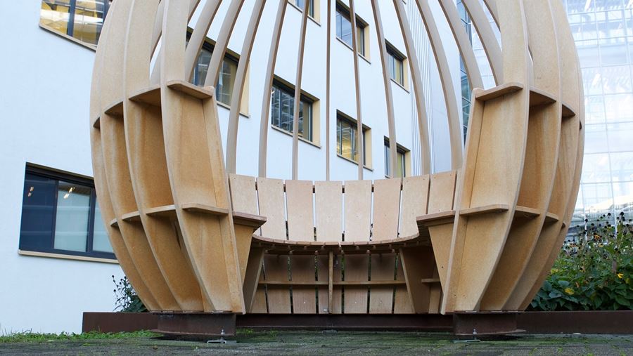 In de binnentuin van het Martini Ziekenhuis werd maandag de Oyyo onthuld, een designmeubel in de vorm van een ei.
