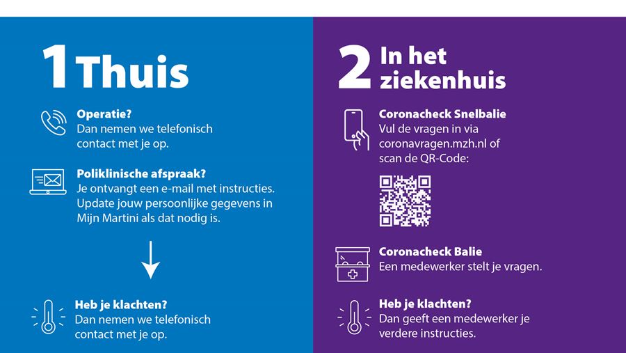 Het Martini Ziekenhuis biedt veilige zorg. Dit waarborgen we met een combinatie van maatregelen. De screening op klachten die bij het coronavirus passen is hierin een belangrijke schakel. Hiermee beperken we het besmettingsrisico zoveel mogelijk. Dit doen we met twee checks: enkele dagen voordat een patiënt een afspraak in het ziekenhuis heeft en bij binnenkomst in het ziekenhuis. Ook bezoekers en begeleiders worden aan de deur gecheckt.