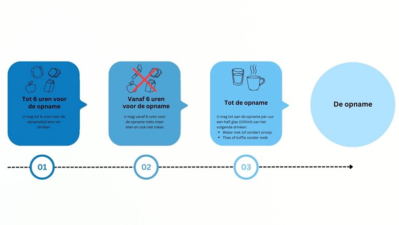 Het belangrijkste is dat u in de 6 uren voorafgaand aan de opname niet meer eet en/of rookt. U mag per uur een half glas (100 ml) het volgende drinken: