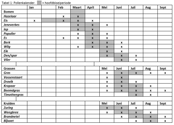In de tabel hieronder ziet u wanneer welke pollen in de bloei staan.